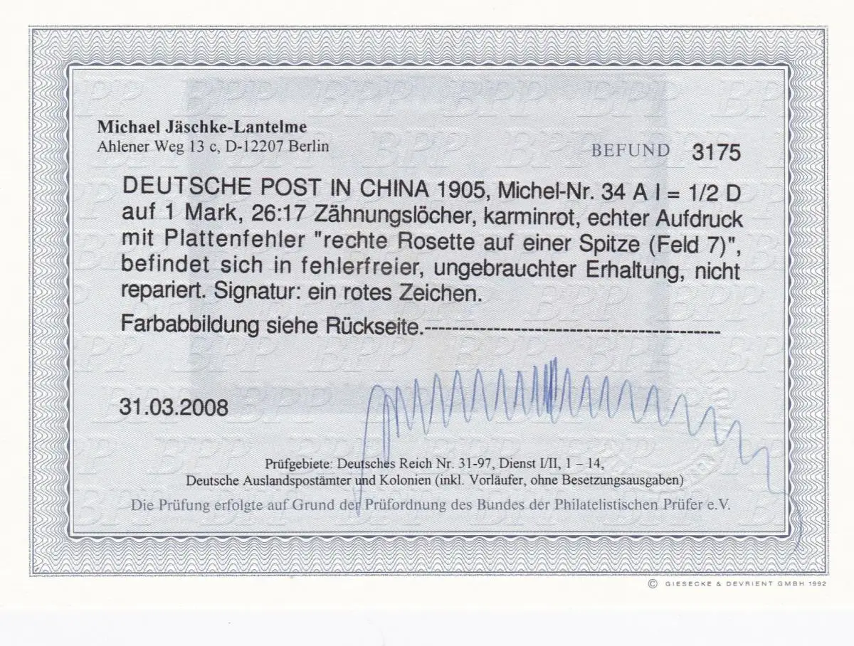 Chine: MiN° 34 AI, 1905, *, BPP résultats