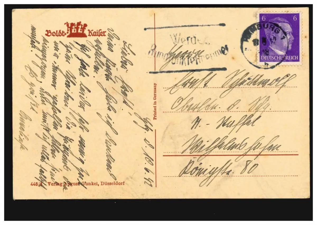 Carte d'ombre Schwarzbild Schilder Bildss, Editeur August Gunkel, Düsseldorf, Stamp publicitaire Radiospectateurs HAMBURG 10.6.1942 Vérification: original Référence produit: 00000000030695>Note: Cet article n'est disponible qu'une seule fois. Vous recevrez exactement l'article représenté.