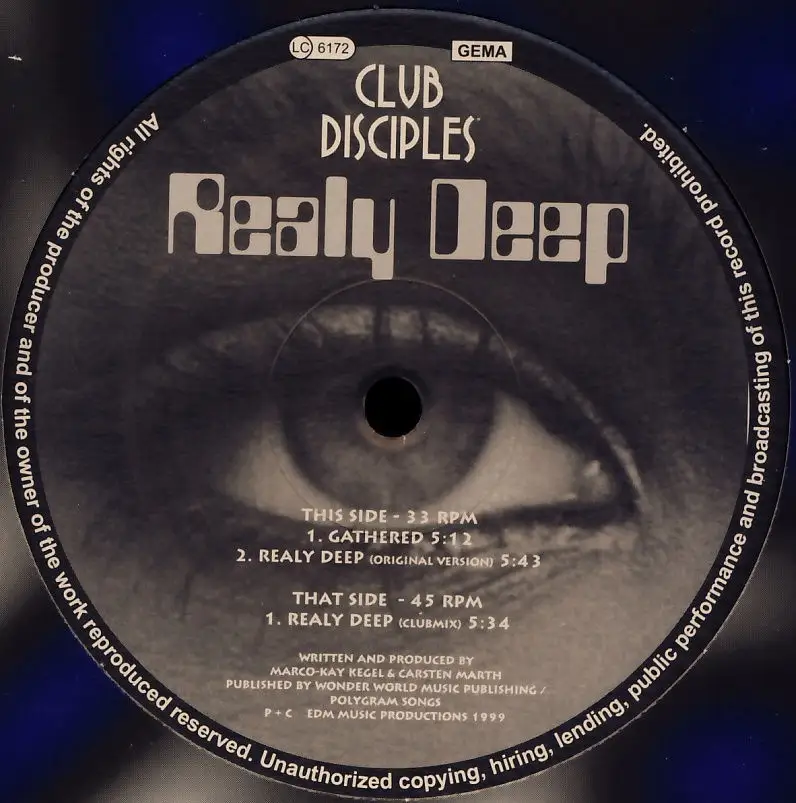 12" Maxi Club Disciples - Realy Deep, Coverceuse unitaire de la société de disques, État Platte VG+ Hülle VD+; Fabriqué en Allemagne 1999 EDM EMD 666-6, Tracks [Clubmix] 5:34, Gathered 5:12, [Original Mix] 5:43