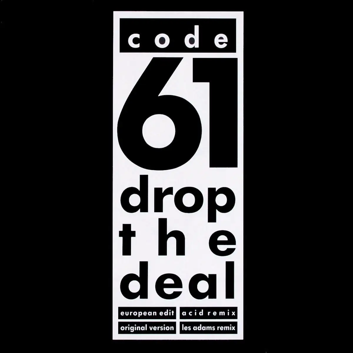 12" Maxi Code 61 - Drop The Deal, Remix, État plaque M-enveloppe M; 1989 BCM Records 12184, Tracks [European Edit] 5:05, [Original Version] 5:57, (Acid Remix) 5:35,[Les Adams Remiss] 6:48