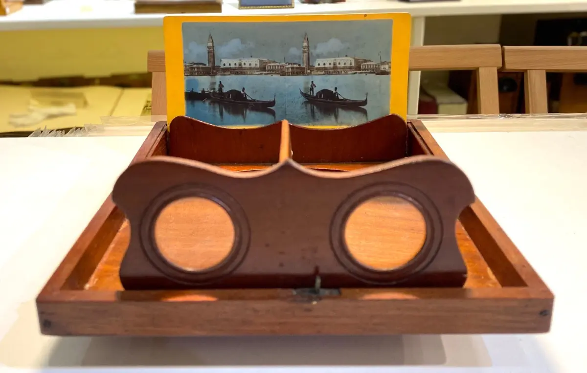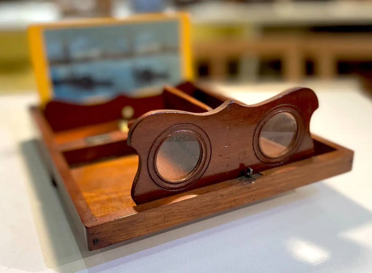 Coffret en bois contenant une visionneuse stéréoscopique.
