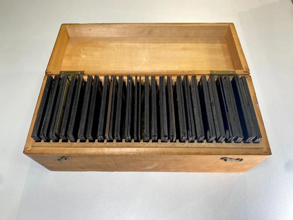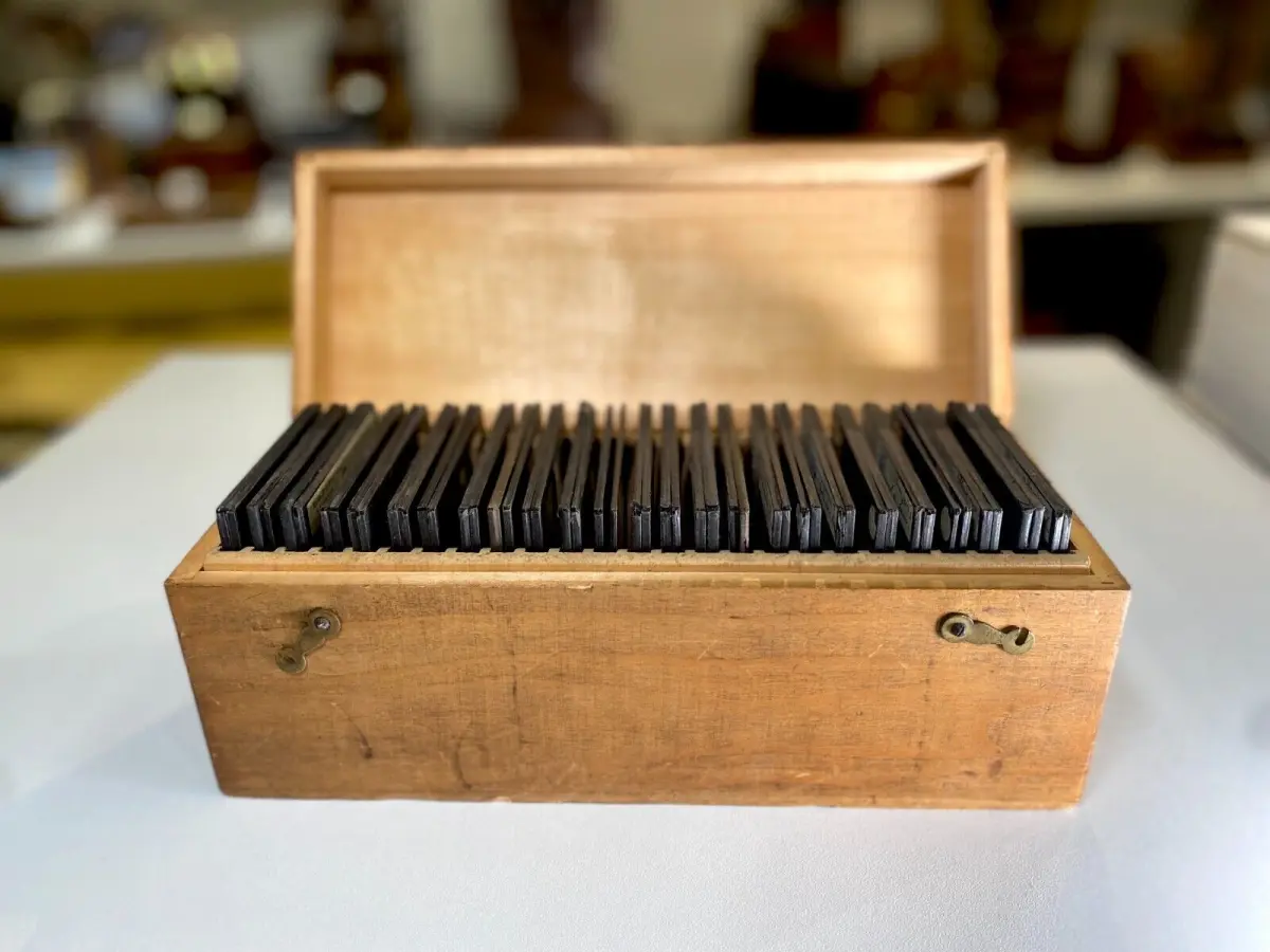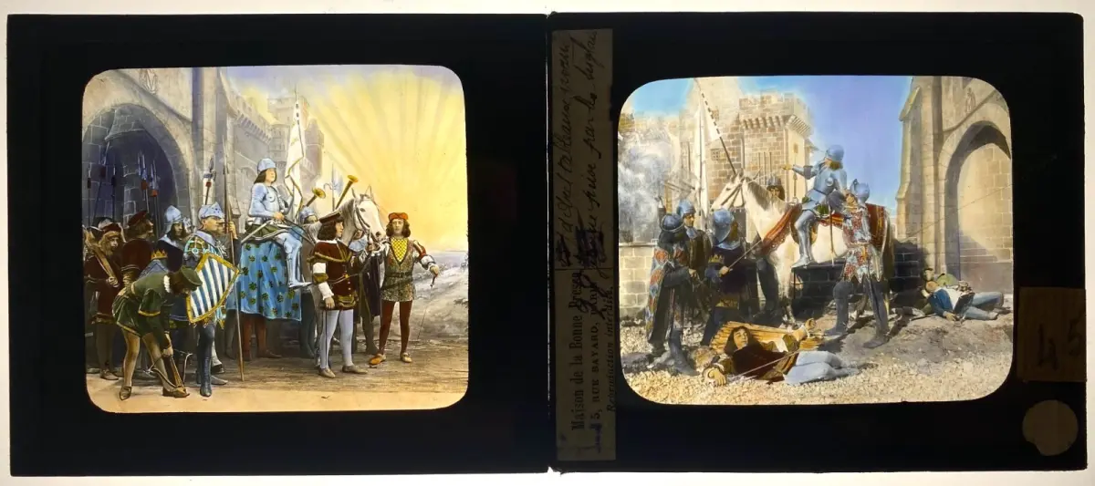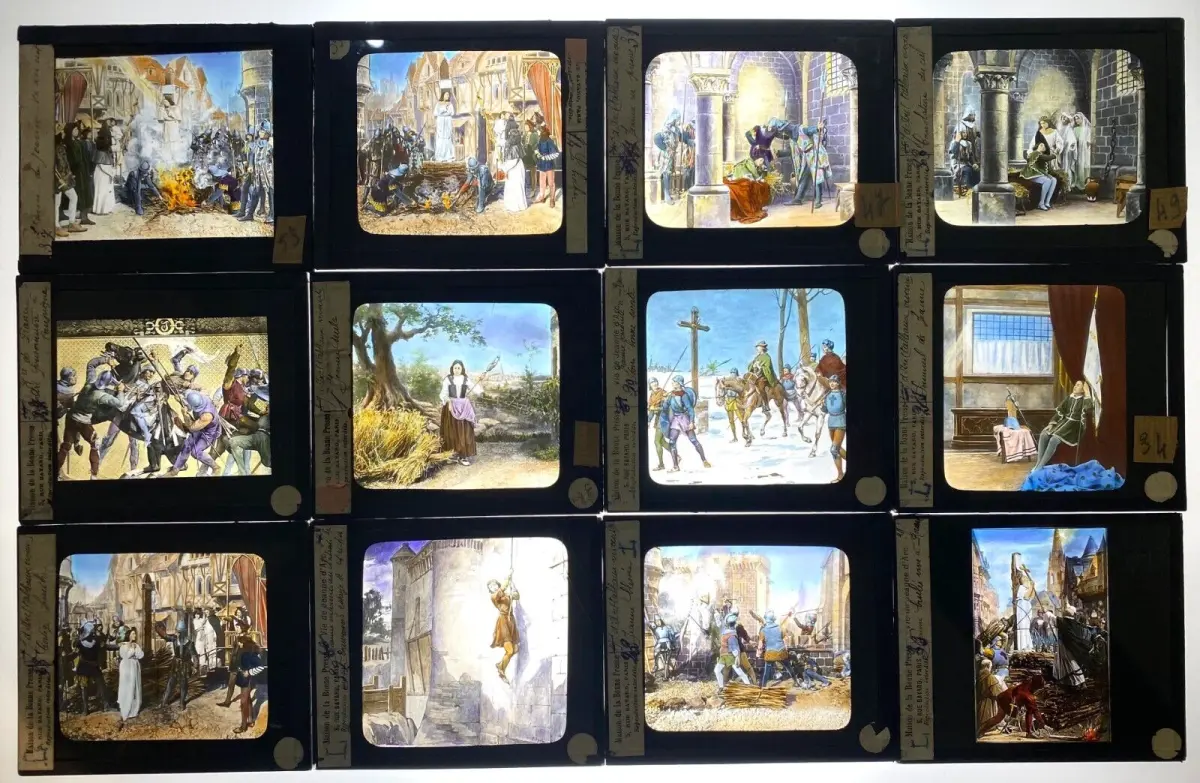 Rare collection complète de 50 plaques de verre peintes à la main de la vie de Jeanne d'Arc par la Maison Bayard dans son coffret d'origine.