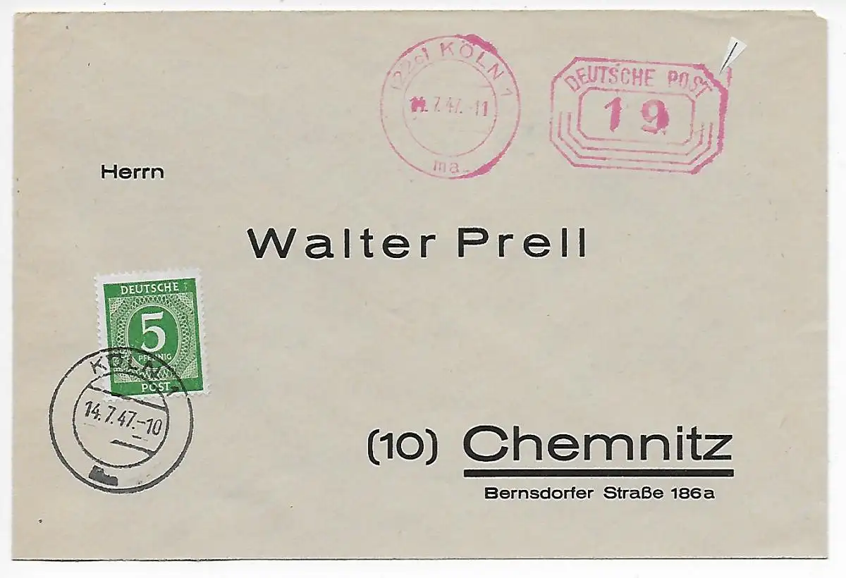 Cologne, Prell Brief, 1947 Feistampt a Chemnitz avec supplément