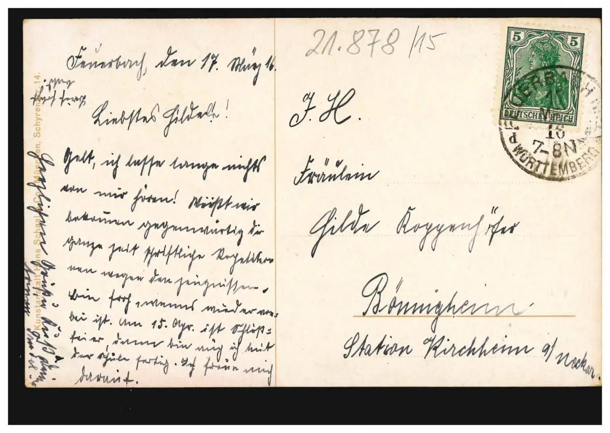 Commande de terrain Artiste-AK dans le pays ennemi, FEUERBACH WÜRTTEMBERG 17.3.1916