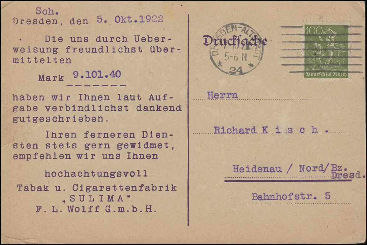 Communication de virement Tabag & Cigarette Sulima DRESDEN-ALTT. 7.10.1922