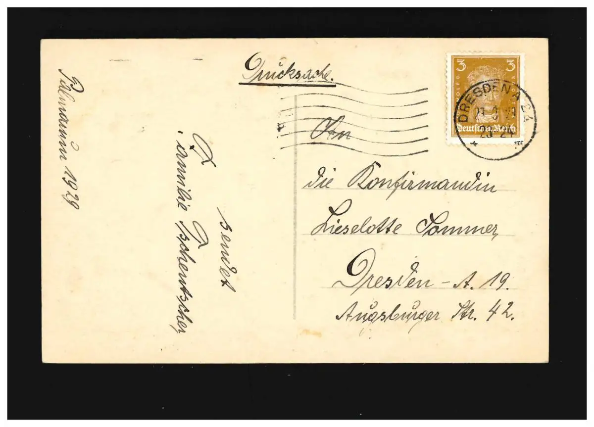 Confirmation Fille à côté de table décorée de fleurs, Dresde 27.3.1929