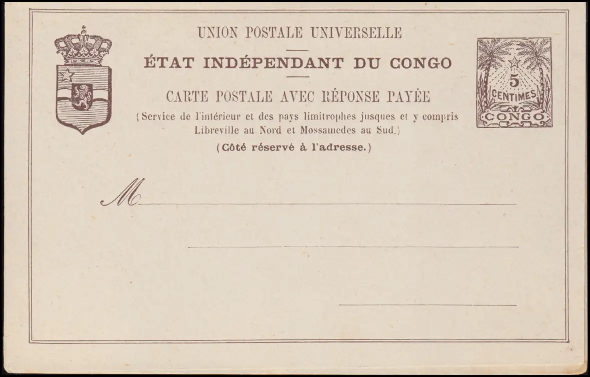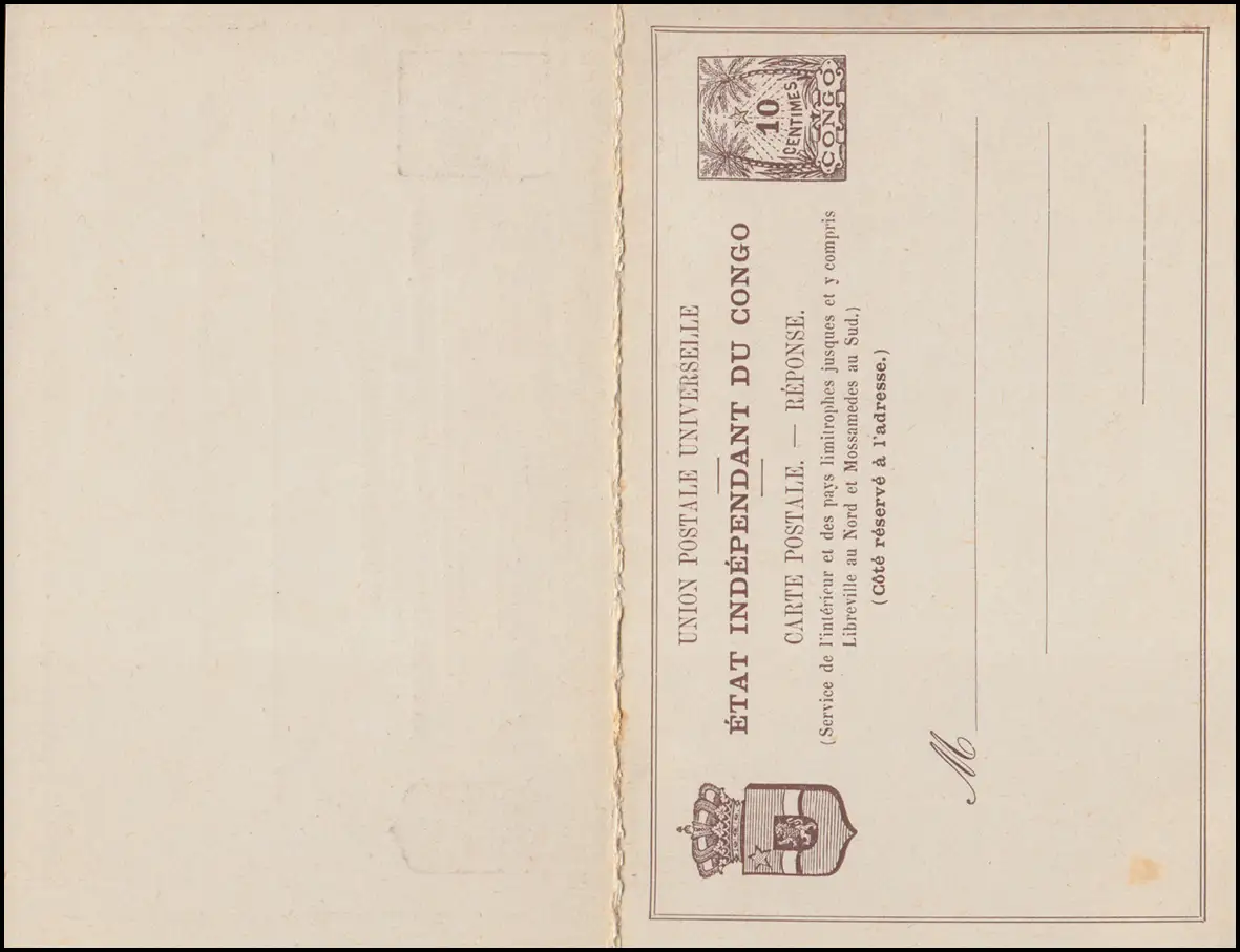 Congo: toute une affaire Carte postale double 5 / 10 centimes, vers 1895, inutilisé **