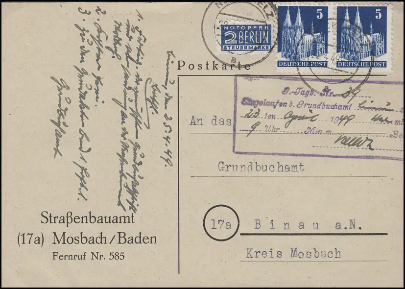 Constructions 5 Pf MeF Carte postale Rues de Mosbach/Baden NECKARELZ 22.4.49 n. Binau