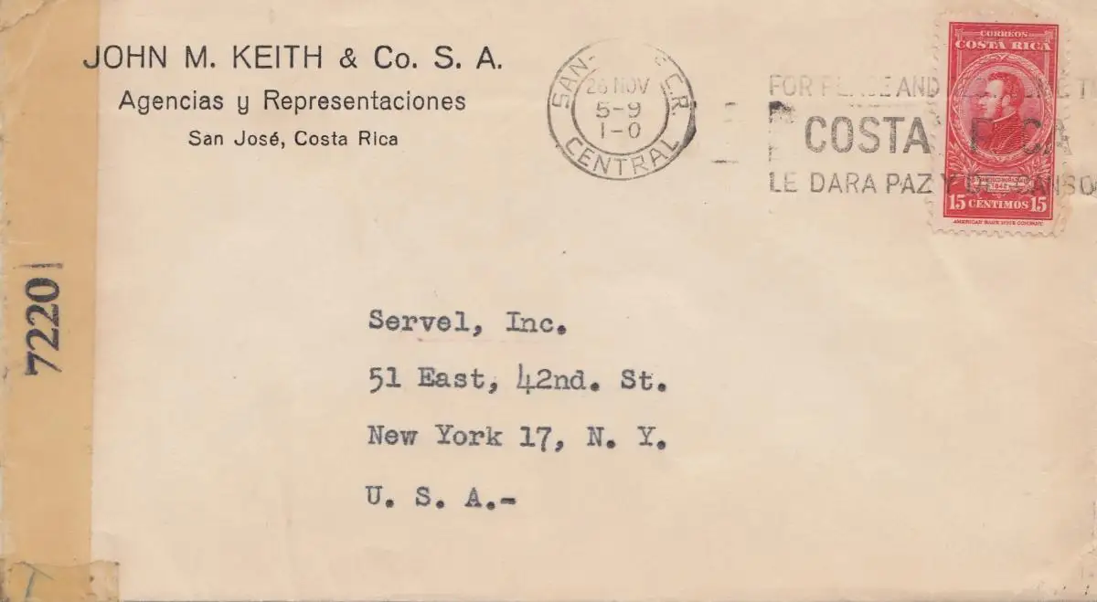 Costa Rica: 1944 air mail San Jose to New York - centre