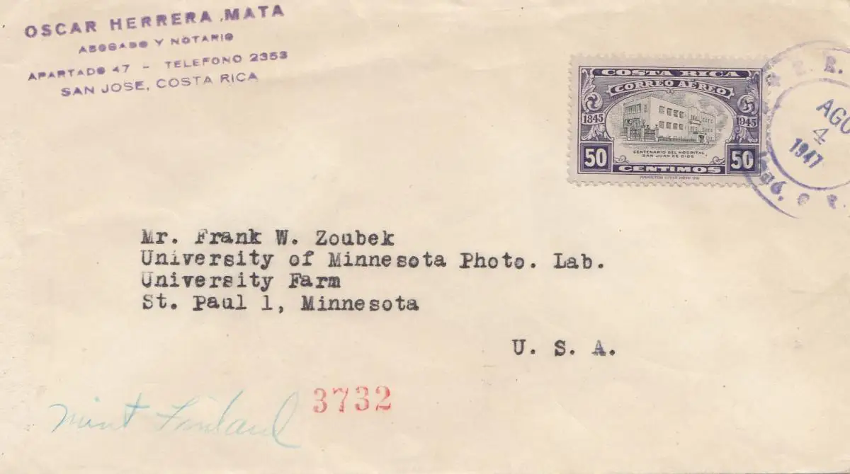 Costa Rica: 1947: Air Mail San Jose to Minnesota - University