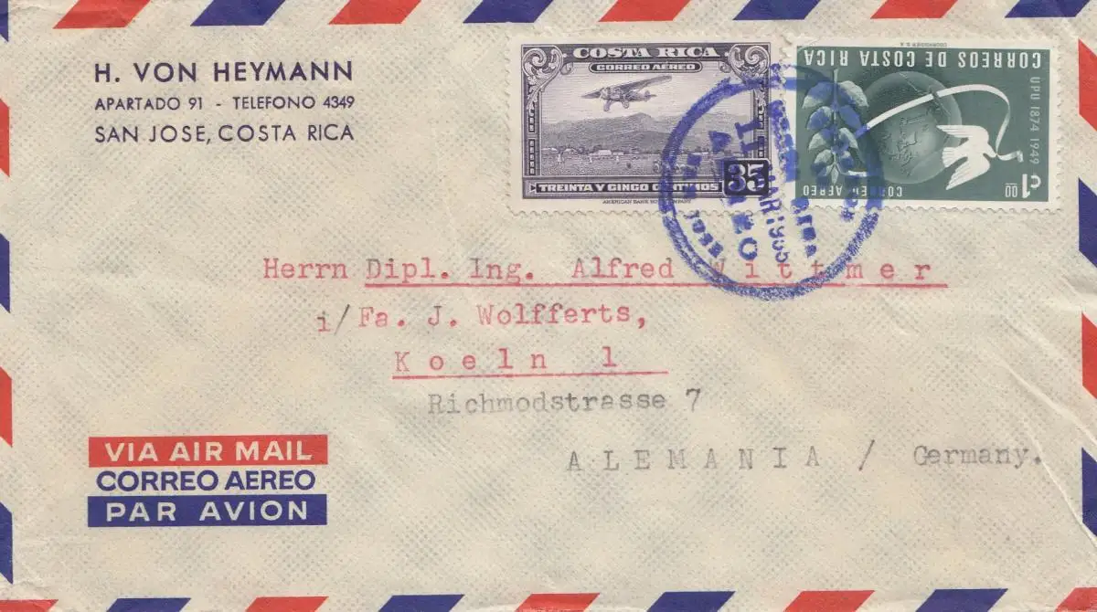 Costa Rica: 1955: San Jose to Cologne via air mail