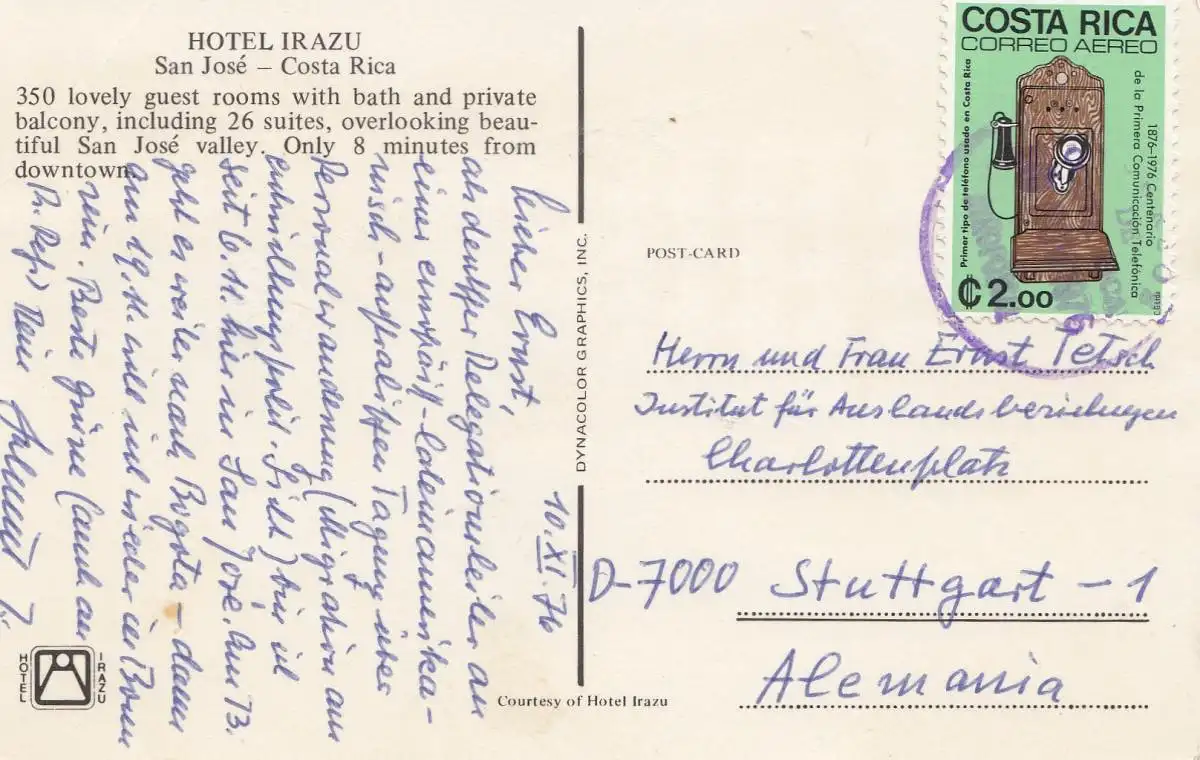 Costa Rica: 1976: Post card Hotel Irazu-San Jose