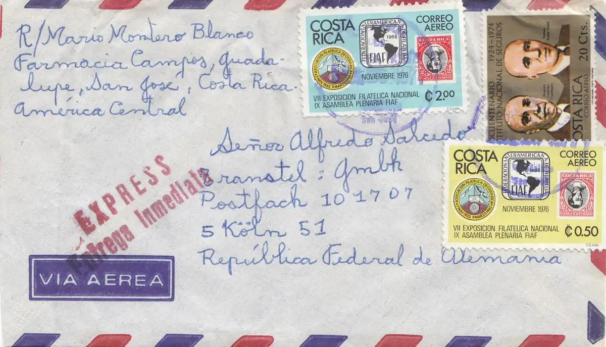 Costa Rica: 1977 letter Express San Jose to Cologne