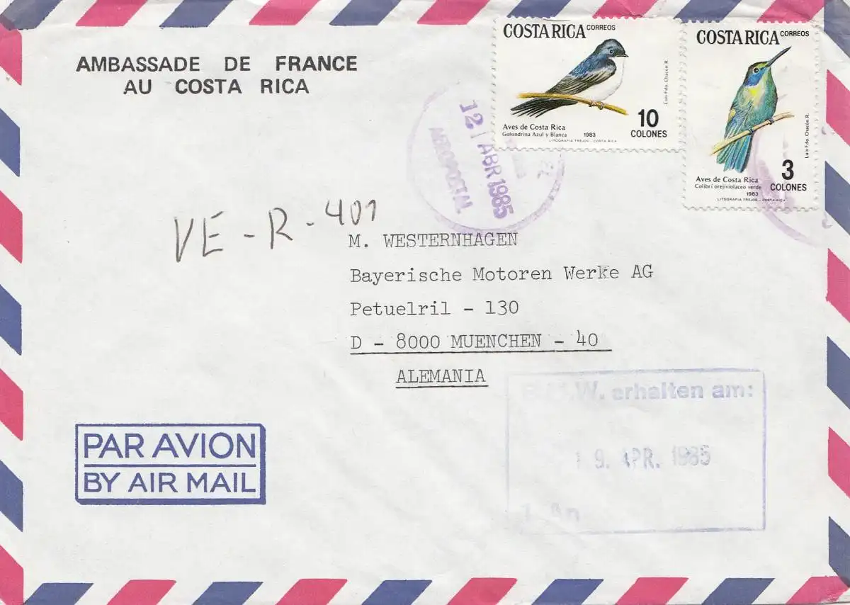 Costa Rica: 1985: Air Mail Ambassade de France to Munich - BMW