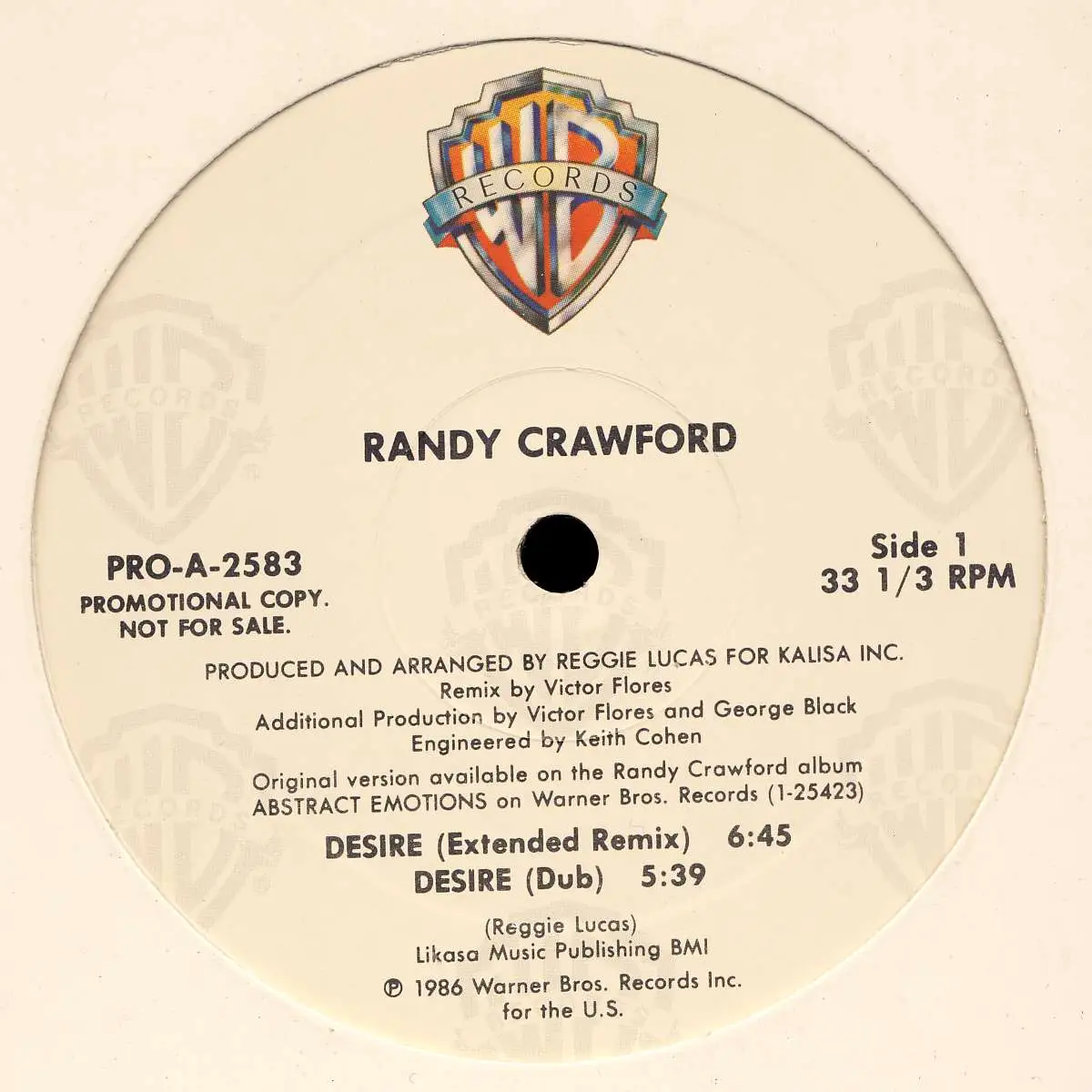 12" Maxi Randy Crawford - Desire, Promo, Unitcover der Disque Company, État Platte VG+ Holle VD+; Fabriqué dans United States 1986 Warner Bros. PRO-A-2583, Tracks [Extended Remix] 6:45, [Dub] 5:39,[7&quoi; Remix] 4:17, Bonus Beats 2:00, (Acappella) 4:35