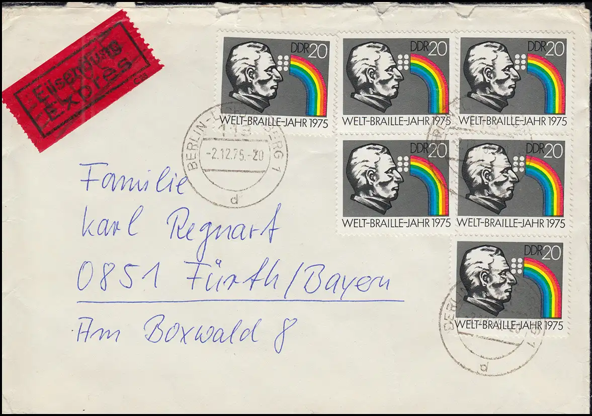 DDR 2090 Braille Année mondiale de la braille Lettre d'urgence BERLIN-SCHÖNEBERG 2.12.75