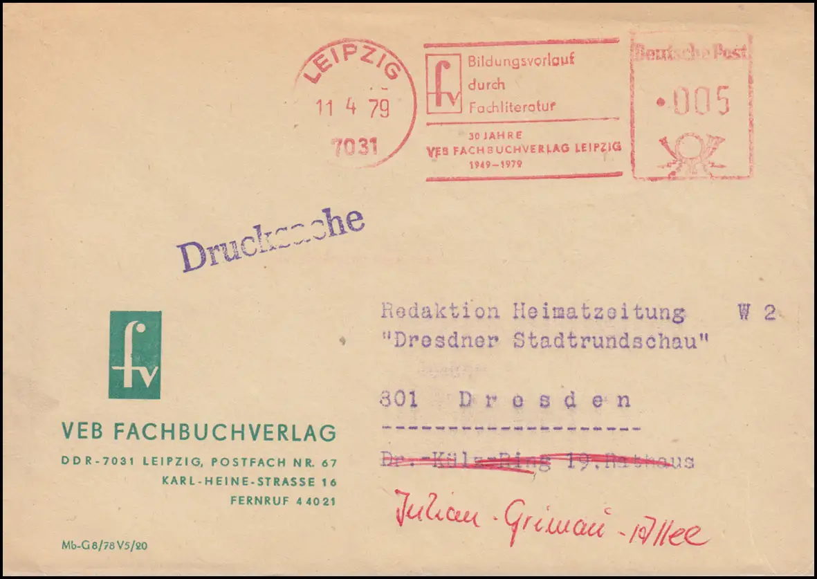 DDR AFS VEB Editeur d'écoles techniques LEIPZIG 11.4.1979 sur l'impression après Dresde