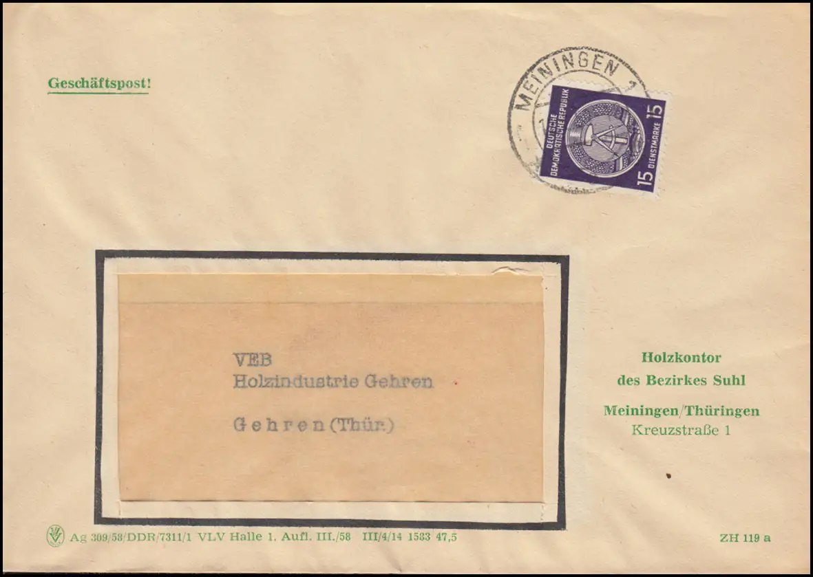 DDR Service 15 Pf. Circle EF Lettre de fenêtre Poste d'affaires Compte en bois MONIEN 1959