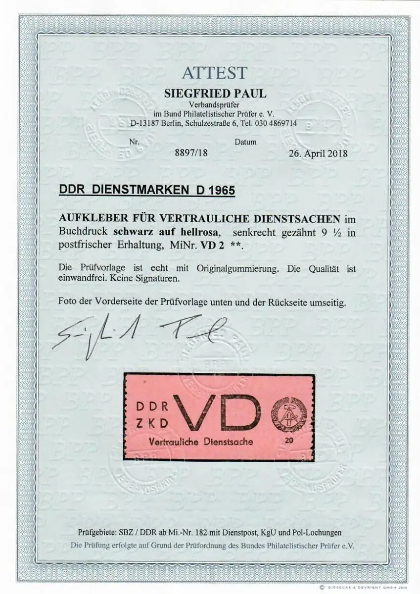 DDR: D 1965, Min. VD2, **, post-fraîchissement, BPP Attest