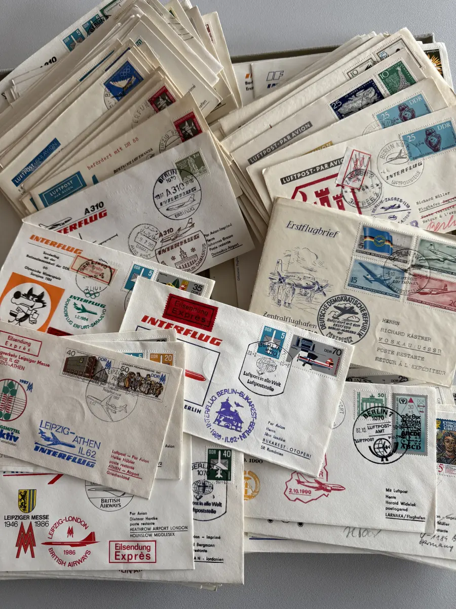 Zwei offizielle Schatullen der Fluggesellschaft der DDR INTERFLUG mit über 250 augenscheinlich nur verschiedenen, echt geflogenen (Erst-)-Flugbriefen und -karten ab Ende der 50 Jahre bis zum Ende der DDR 1990. Dabei viele besondere Versendungsformen, tolle Frankaturen und Ankunftsstempel aus allen möglichen Ländern. Tolle Kollektion!