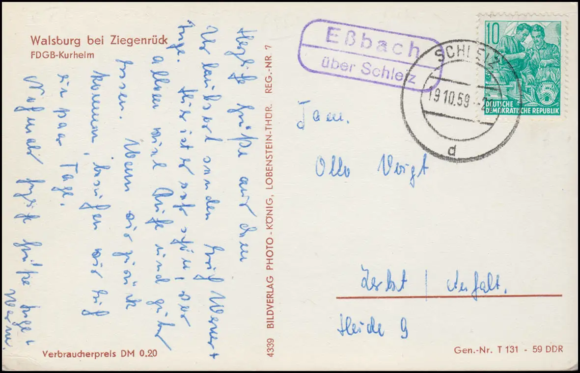DDR Landpost Essbach sur SCHLEITZ 10.10.59 sur AK Walsburg près de Kögerrück
