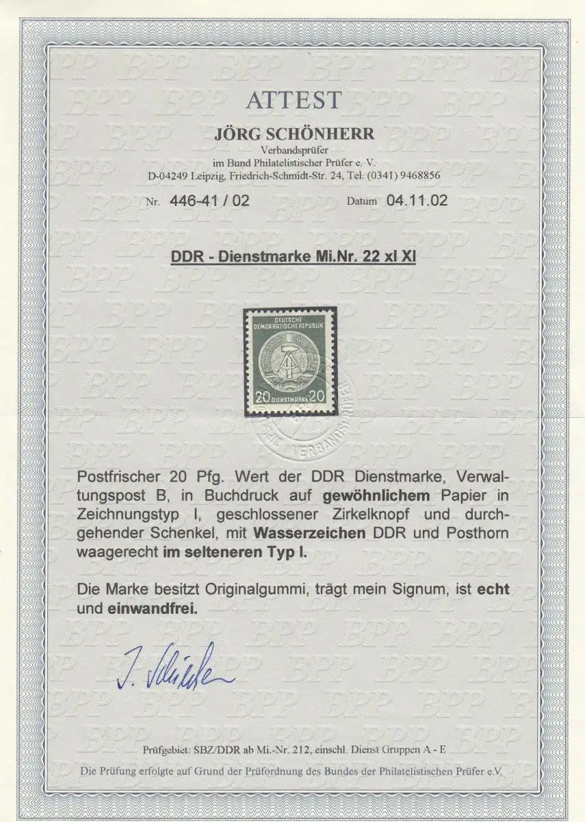 DDR: Libellé de service N° 22 xl XI, frais de port, BPP Attest