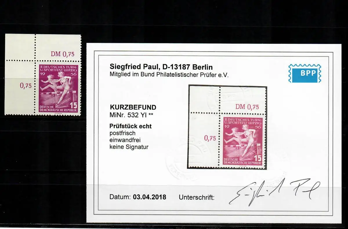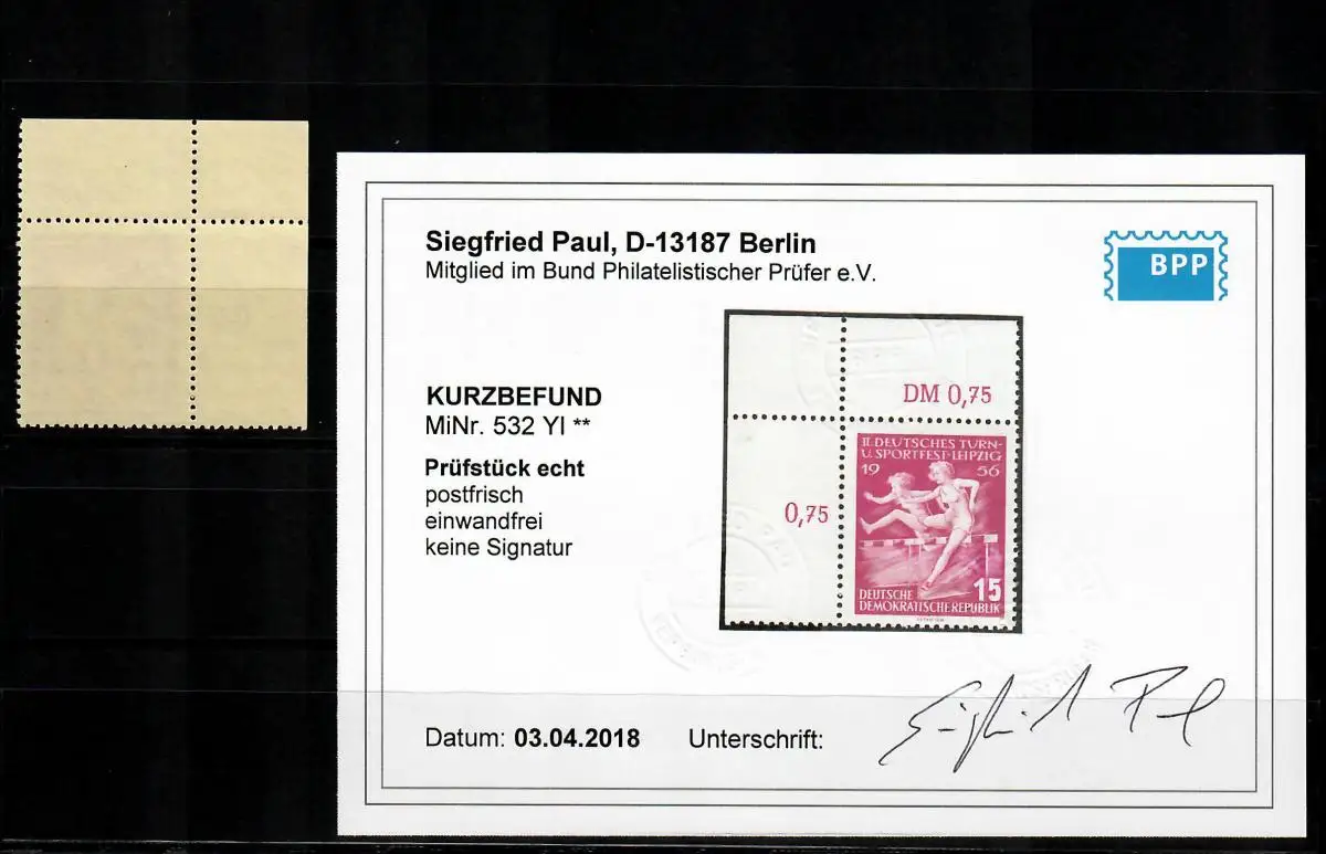 DDR Min° 532 YI , Eckrand E1, post-fraîchissement, **, BPP résultat