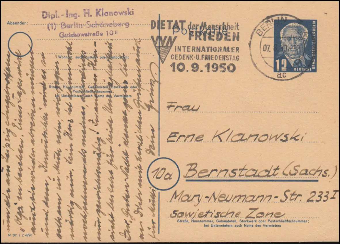 DDR P 45/01 Pieck Impression M 301 Z 4296, Promotion-O Paix VVN BERLIN 7.8.1950