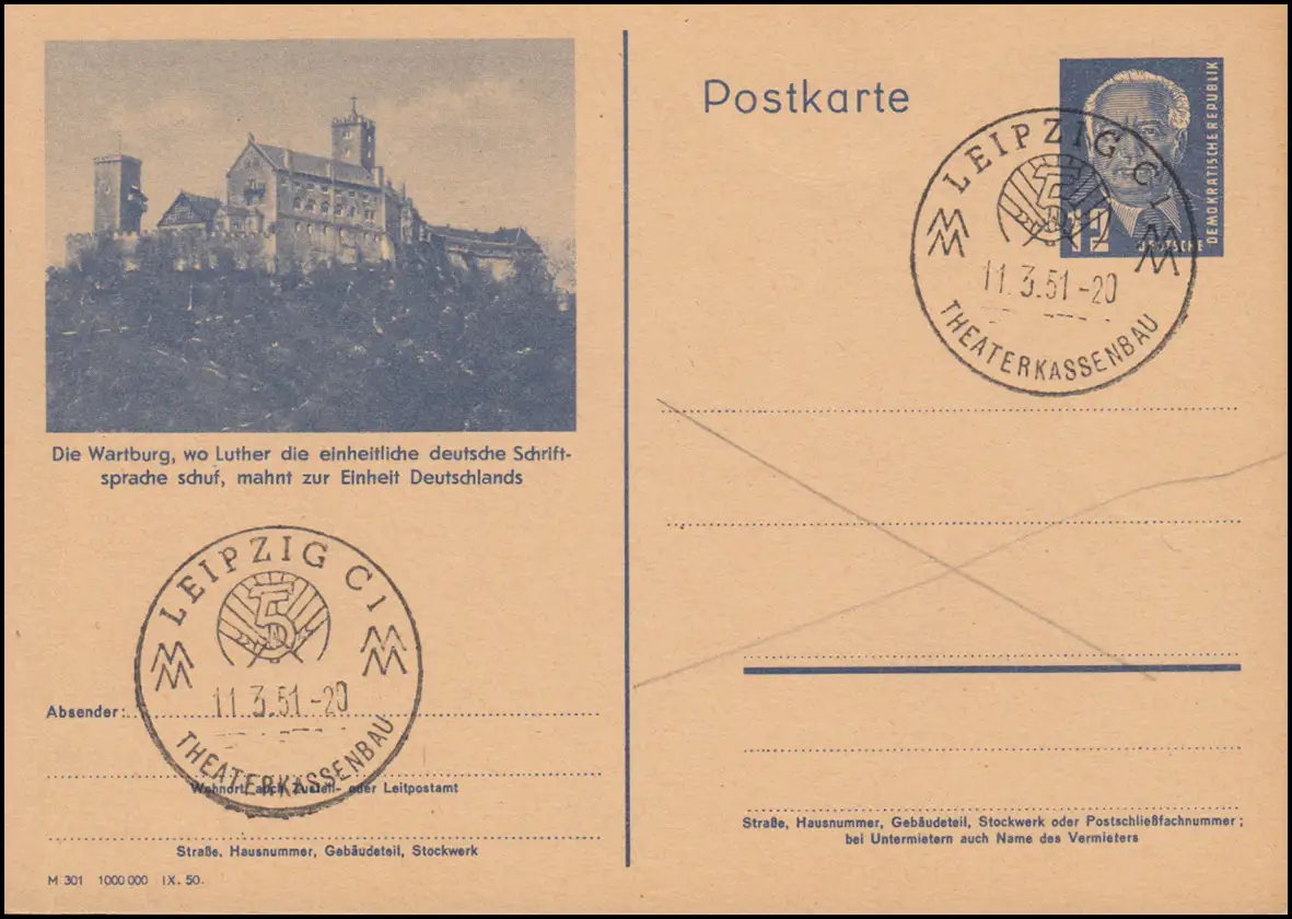 DDR P 47/04 Wartburg ... où Luther, SSt LEIPZIG Messe THEATERKASSENBAU 11.3.1951