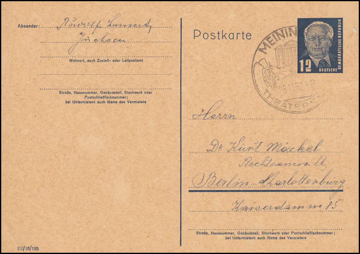 DDR P 50/03 Pieck: note d'impression III/18/185 SSt MEININGEN THEATERSTADT 28.11.1952