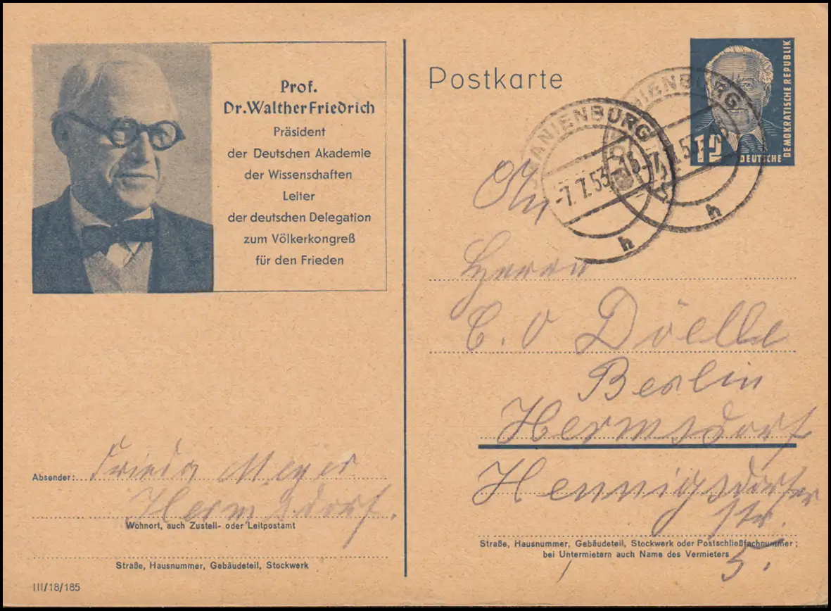 DDR P 52/01 Prof. Dr. Walther Friedrich ORANIENBURG 7.7.1953 n. Berlin-Hermsdorf
