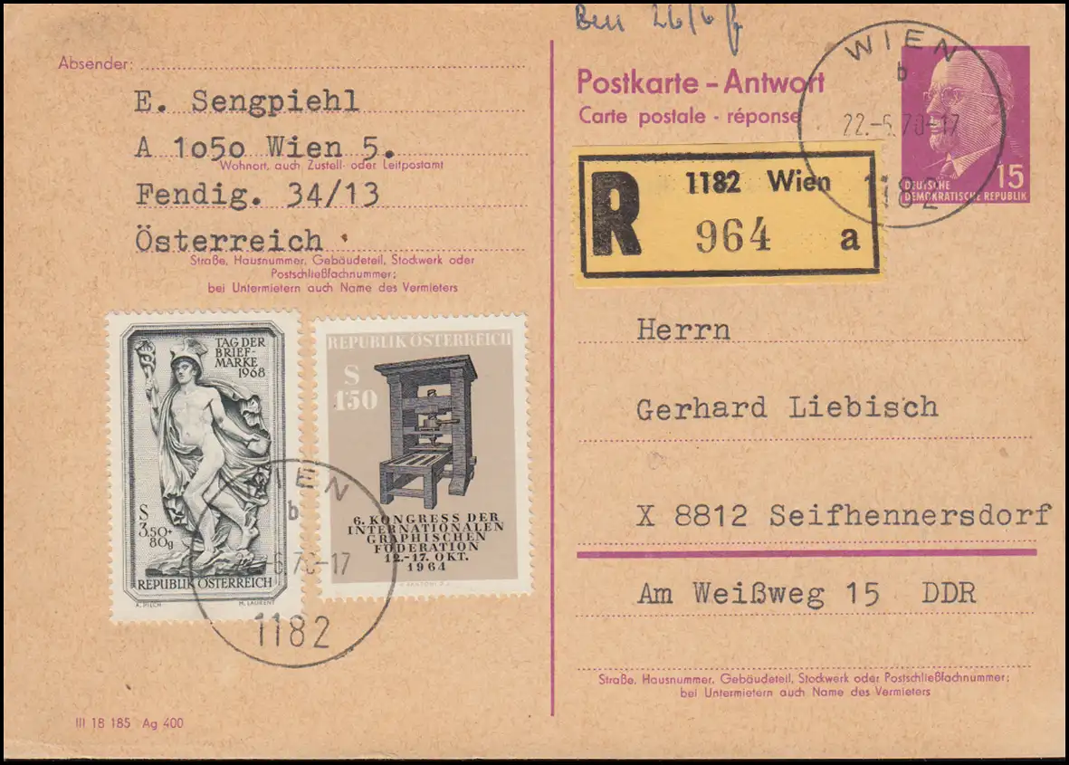 Antwotteil Ulbricht 15 Pf. avec Francotature autrichienne supplémentaire comme carte postale par lettre recommandée de 1182 WIENNE 22.5.70 (Autriche) retour vers Seifhennersdorf (RDA) N° de catalogue: P74A Vérification: original Référence produit: 00000000042002