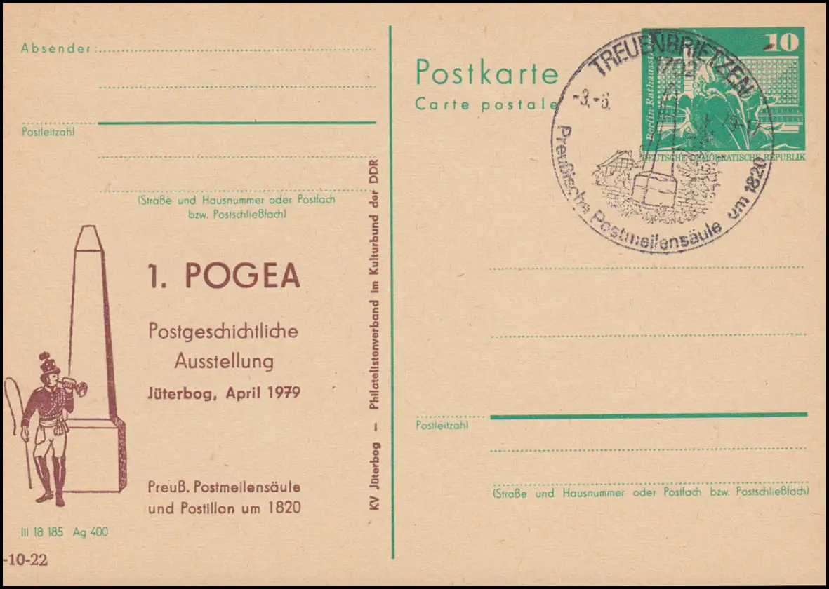 DDR P 79 1. POGEA Jüterbog 1979, SSt TREUENBRITZEN Postmileenäul 3.6.79