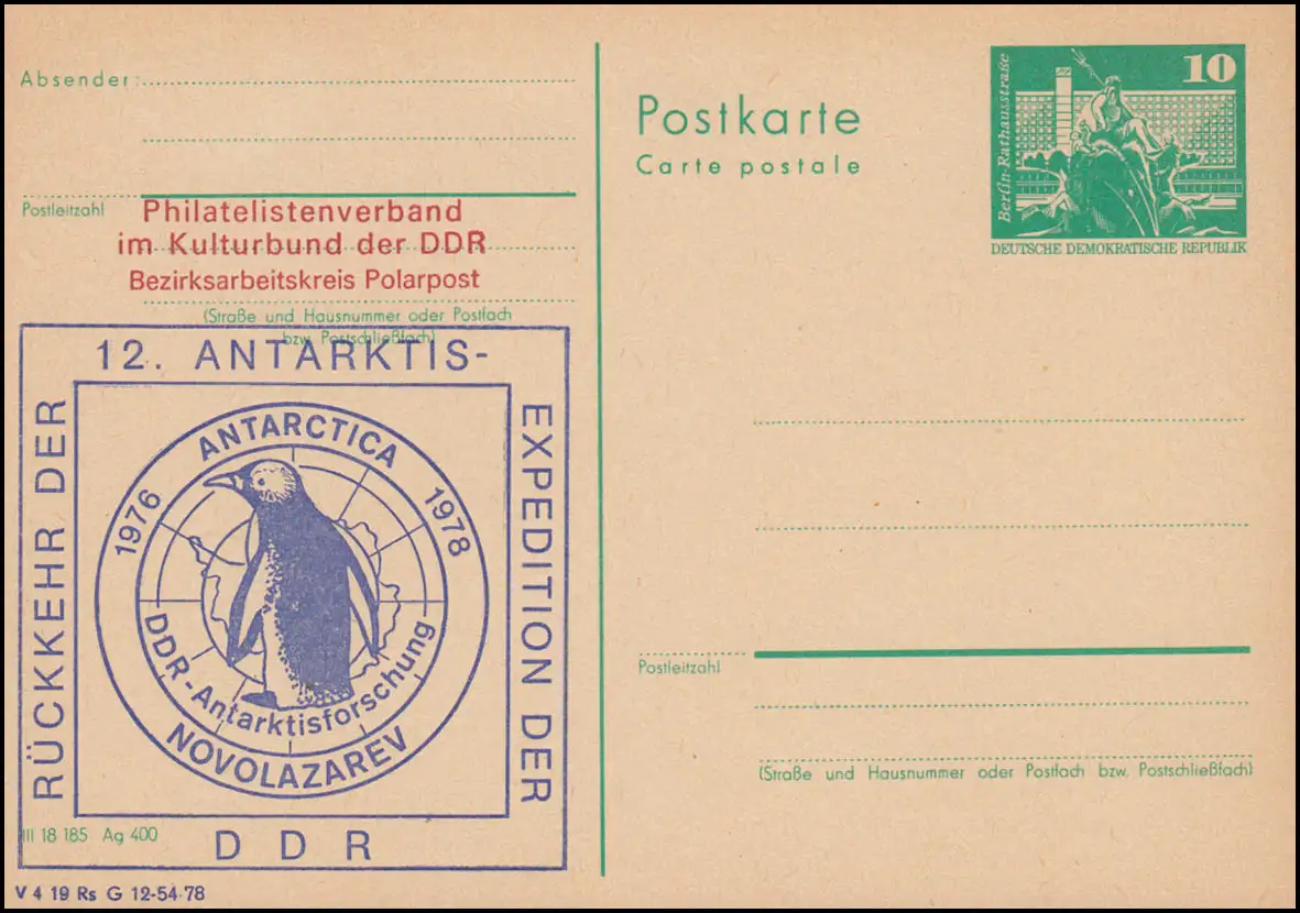 Carte postale DDR P 79 Bauwerke Grossform 10 Pfennig Berlin Rathausstraße, Retour de la 12e expédition de l'Antarctique de DD 1976-1978 / DRDA-Antarctisforschung ANTARTICA NOVOLAZAREV / Figure: Pingouin Numéro de catalogue:P79 Examen: original Numéro d'article: 00000000044475>p>Remarque: Cet article n'est disponible qu'une seule fois. Vous recevrez exactement l ' article illustré.