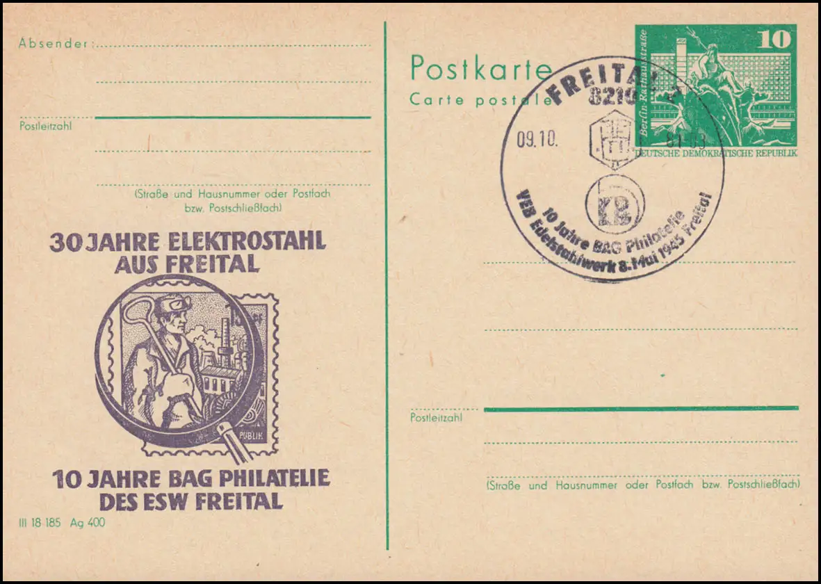 Carte postale DDR P 79 Bauwerke Grossform 10 Pfennig Berlin Rathausstraße, 10 ans BAG Philatelie des ESW Freittal / Figure Marque à cinq caractères Stahlschliefer mit Hüttenwerk N° de catalogue: P79 Examen: original Référence produit: 00000000044829>Remarque: Cet article n'est disponible qu'une seule fois. Vous recevrez exactement l'article représenté.
