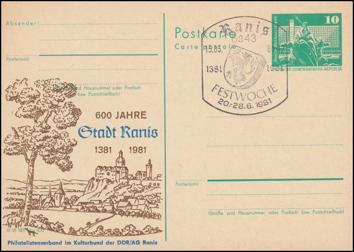 DDR P 79 600 ans Ville de Ranis 1381-1981, SSt RANIS WEB Fête 1981