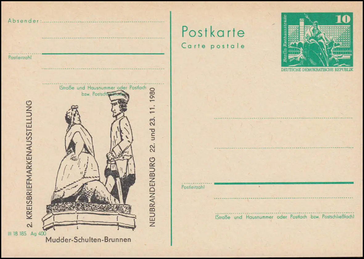 Carte postale DDR P 79 Bauwerke Grossform 10 Pfennig Berlin Rathausstraße, Figure: Mudder-Schulten-Bunnen (Figures de la fin du poète allemand Fritz Reuter) N° de catalogue: P79 Examen: original Numéro d'article: 00000000044774