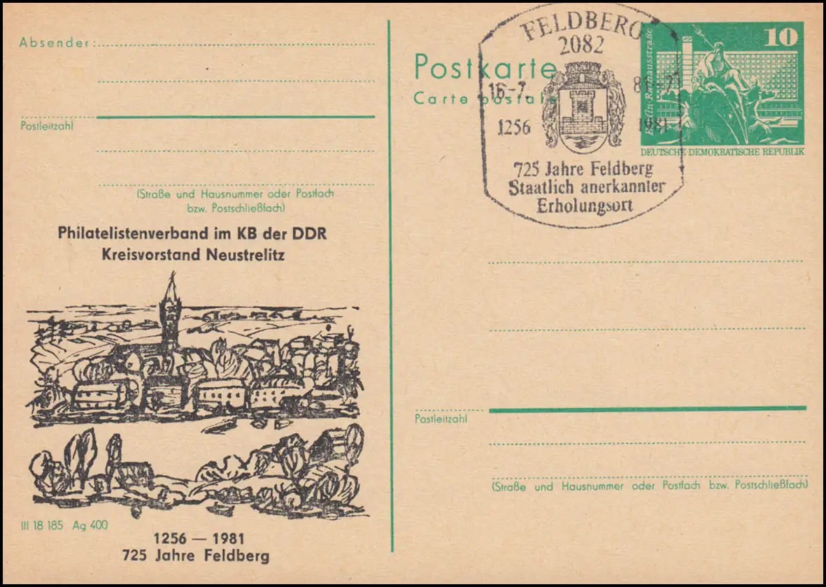 DDR P 79 Direction de district Neustelitz 725 ans Feldberg 1981, SSt FELDBERG Wappen