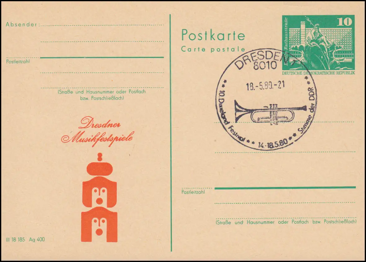 Carte postale DDR P 79 Bauwerke Grand format 10 Pfennig Berlin Rathausstraße, Stamp spécial: DRESDEN 10. Dixilan Festival / Voix de la RDA / Figure: Trompette Numéro de catalogue: P79 Examen: original Référence produit: 00000000044673>Remarque: Cet article n'est disponible qu'une fois. Vous recevrez exactement l'article illustré.