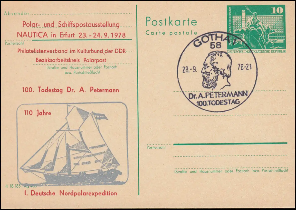 Carte postale DDR P 79 Bauwerke Grand format 10 Pfennig Berlin Rathausstraße, 100e anniversaire de la mort Dr A. Petermamm / 110 ans I. Expédition du pôle Nord allemand / Image: Voilier / Impression expéditeur: Exposition Polaire et Postale NAUTICA in Erfurt Septembre 1978 / Société culturelle de l'Union Démocratique du district de Polarpost N° de catalogue: P79 Examen: original Numéro d'article: 00000000044546>p>Note: Cet article n'est disponible qu'une seule fois. Vous recevrez exactement l ' article représenté.