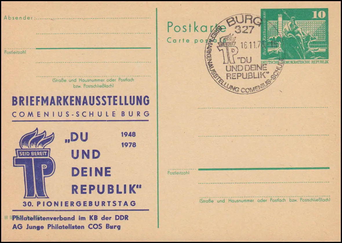 DDR P 79 Exposition Jeune Pioniere Burg 1978, SSt BURG Emblème JP 16.11.1978