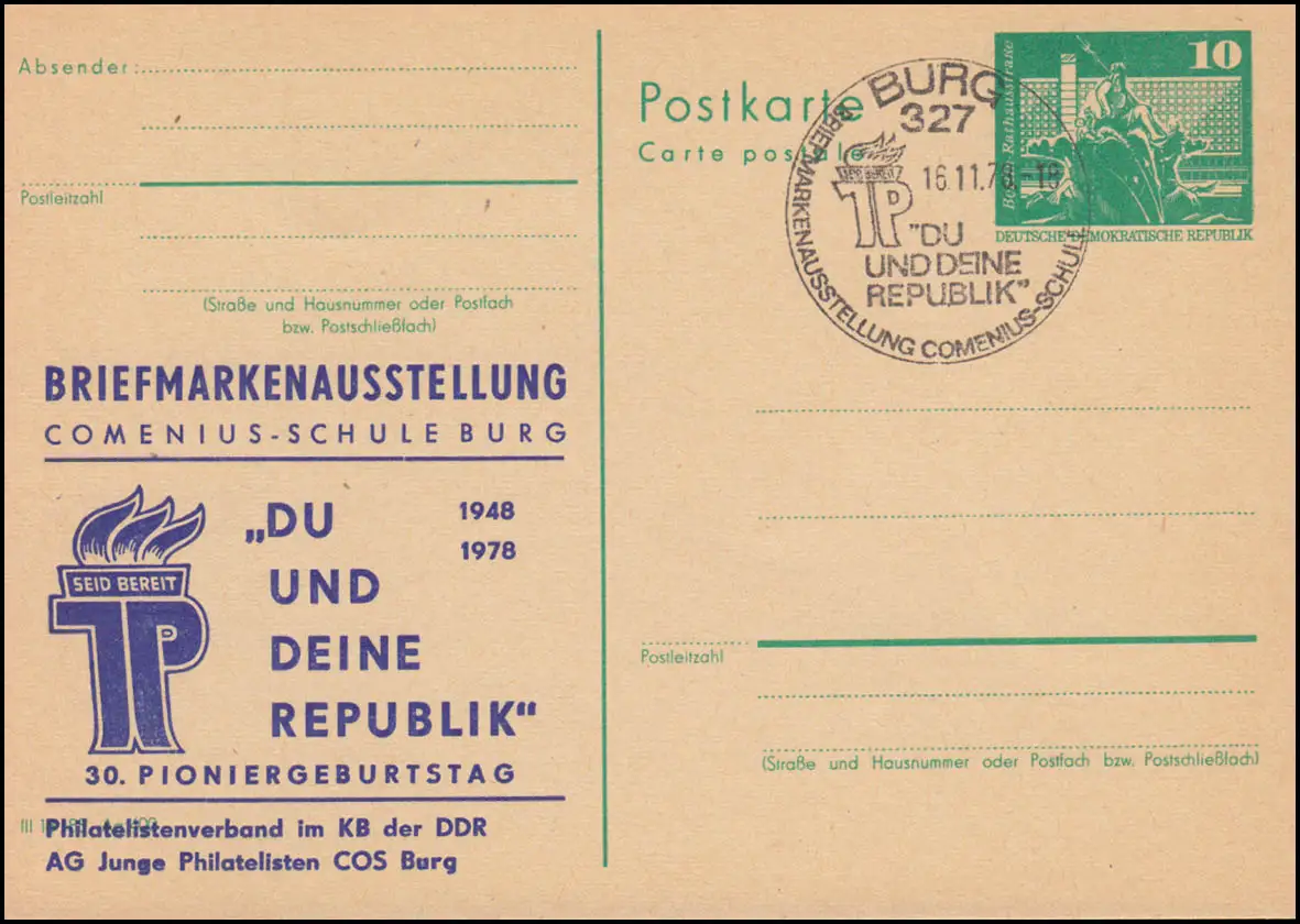 DDR P 79 Exposition Jeune Pioniere Burg 1978, SSt BURG Logo JP 16.11.78