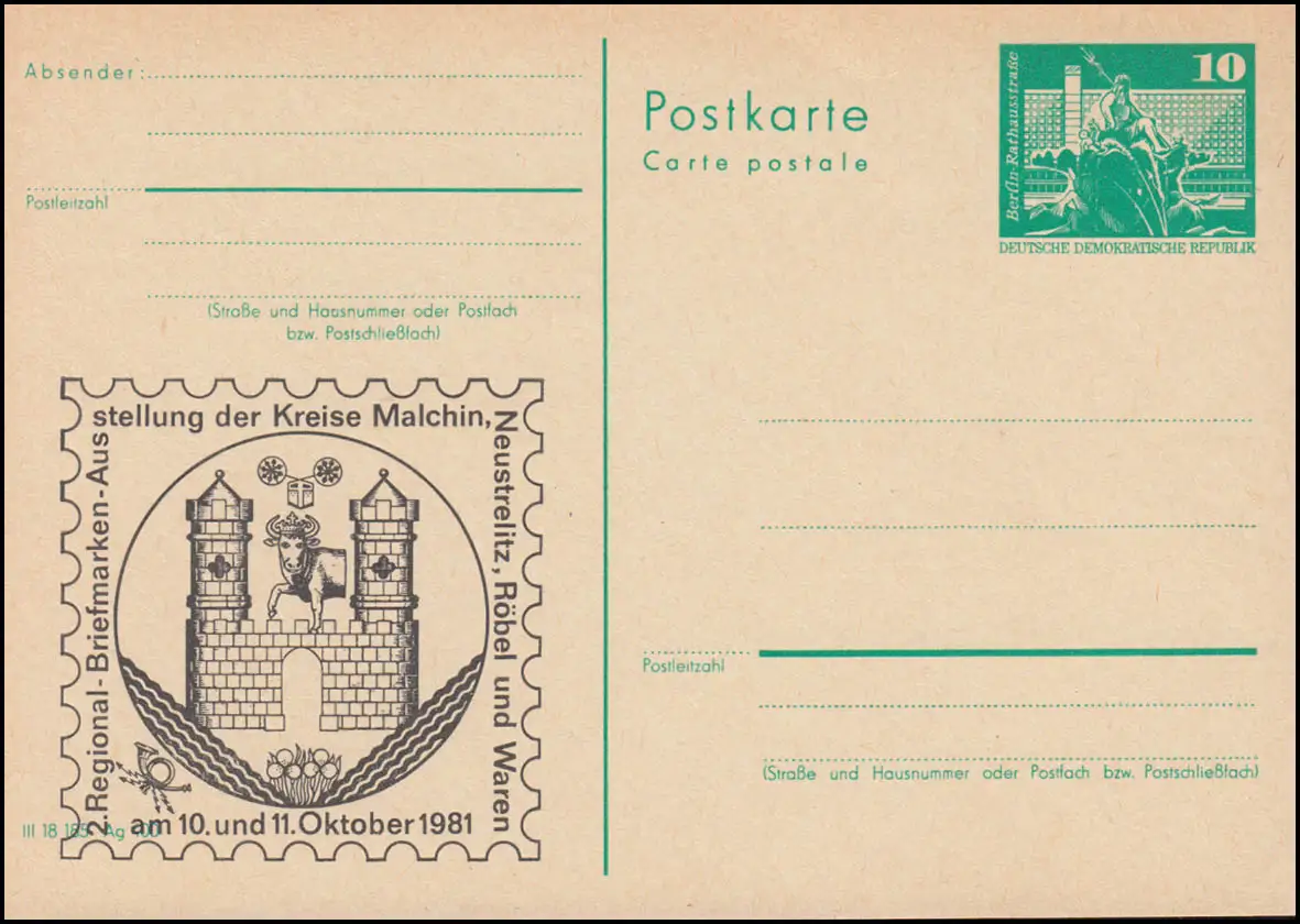 Carte postale DDR P 79 Bauwerke Grossform 10 Pfennig Berlin Rathausstraße, 2. Exposition régionale de la lettre des cercles Malchin, Neustrelitz, Röbel et Waren / Figure Armoiries urbaines de marchandises N° de catalogue: P79 Examen: original Numéro d'article: 00000000044653>Note: Cet article n'est disponible qu'une seule fois. Vous recevrez exactement l'art.