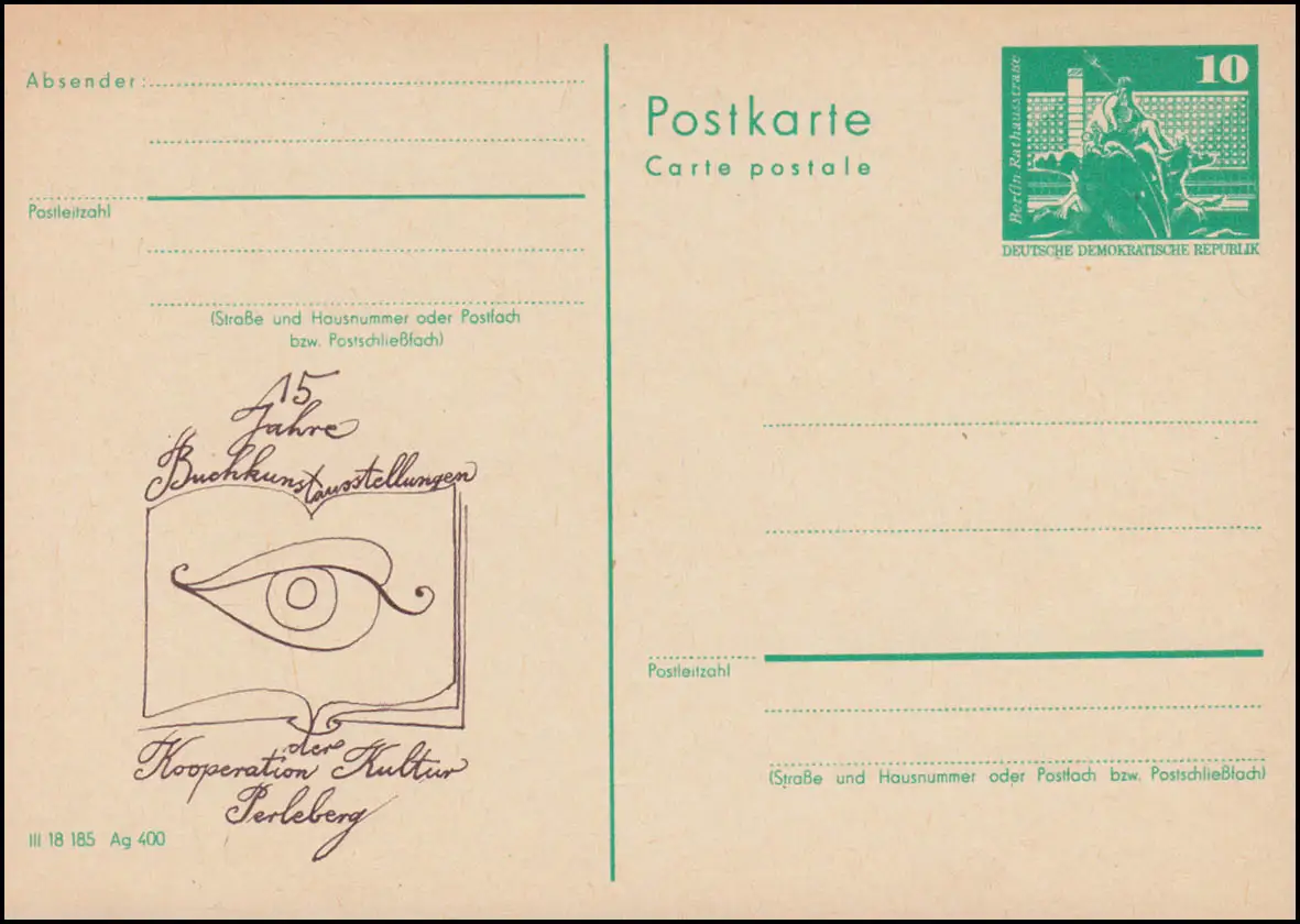 Carte postale DDR P 79 Bauwerke Grossform 10 Pfennig Berlin Rathausstraße, 15 ans d'expositions d 'art de livre dans la coopération Culture Perleberg / Figure: oeil sur la page du livre Numéro de catalogue: P79 Examen: original Référence produit: milliard044684>p>Remarque: Cet article n'est disponible qu'une seule fois. Vous recevrez l'article représenté avec précision.