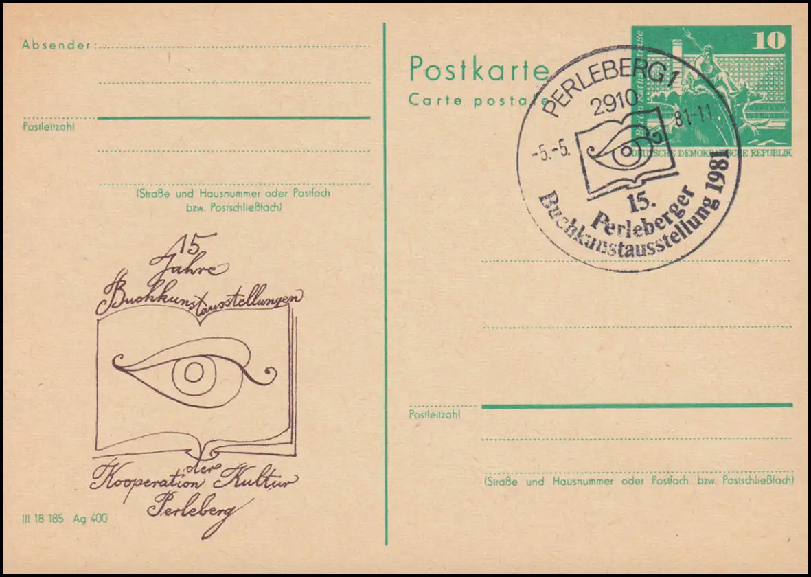 Carte postale DDR P 79 Bauwerke Grossform 10 Pfennig Berlin Rathausstraße, 15 ans d'expositions d 'art de livre en coopération Culture Perleberg / Figure: oeil sur page du livre, cachet spécial: 2910 PERLEBERG 15. PerLeberger Buchkunsexposition 1981 N° de catalogue: P79 Examen: original Numéro d\'article: 018044652