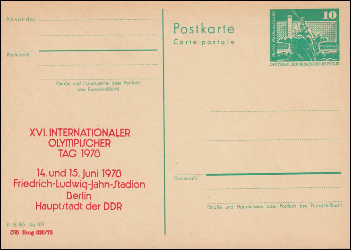 Carte postale DDR P 79 Bauwerke Grand format 10 Pfennig Berlin Rathausstraße, XVI Journée internationale olympique de juin 1978 / Friedrich-Ludwig-Jahn-Stadion Berlin N° de catalogue: P79 Examen: original Numéro d'article: 00000000044805>Note: Cet article n'est disponible qu'une seule fois. Vous recevrez exactement l'élément illustré.