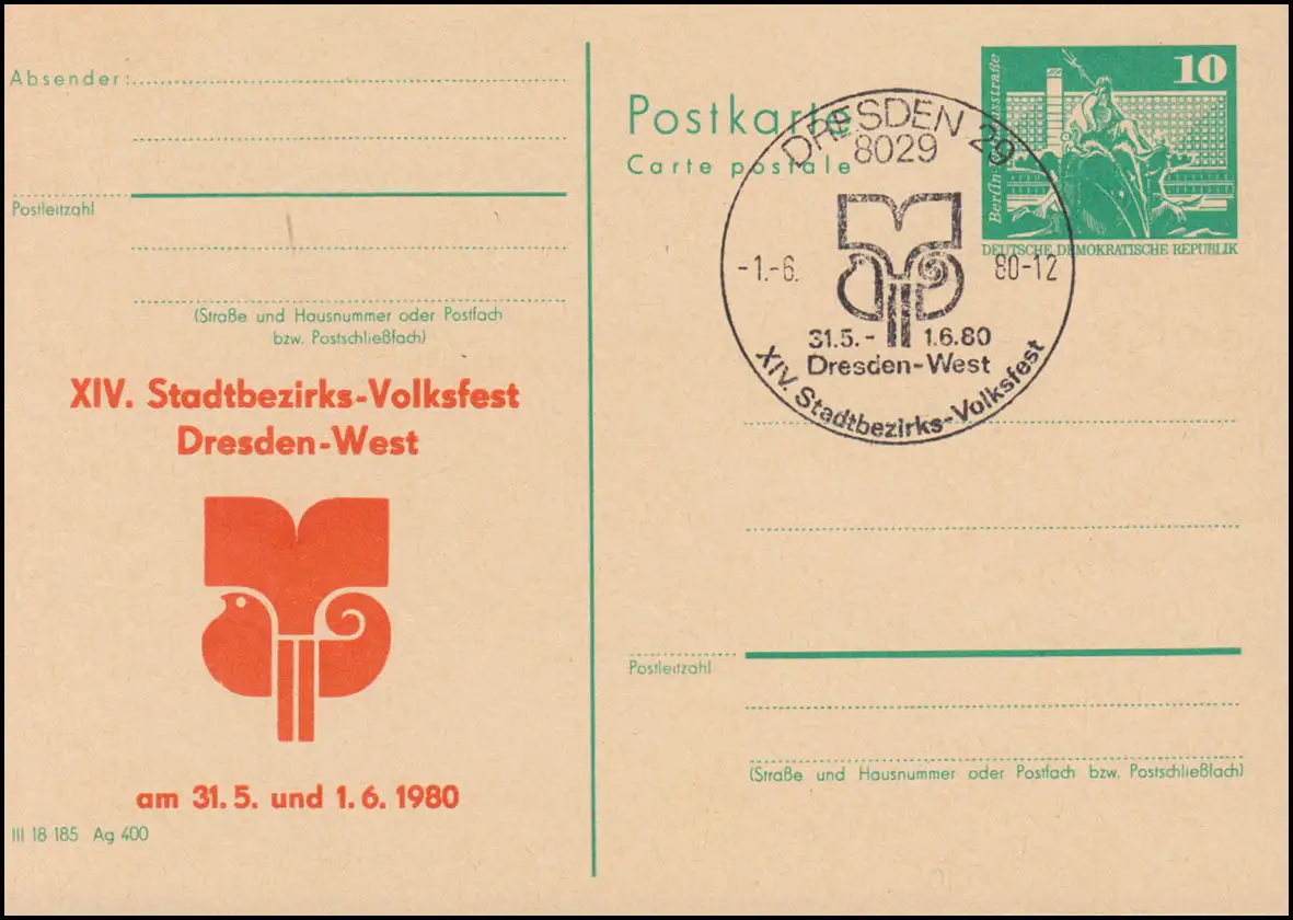 DDR P 79 Festival du district de Dresde-Ouest avec logo 1980, SSt DRESDEN 1.6.80