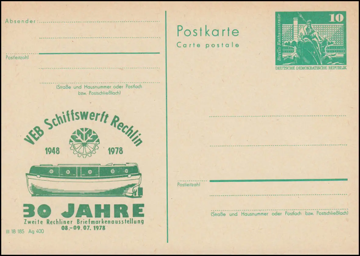 Carte postale DDR P 79 Bauwerke Grand format 10 Pfennig Berlin Rathausstraße, 30 ans VEB Schiffwerk Rechlin / Deuxième exposition de timbres Reichliner Juillet 1978 - Impression en couleur verte N° de catalogue: P79 Examen: original Référence produit: 00000000044547>Note: Cet article n'est disponible qu'une fois. Vous recevrez exactement l'article représenté.