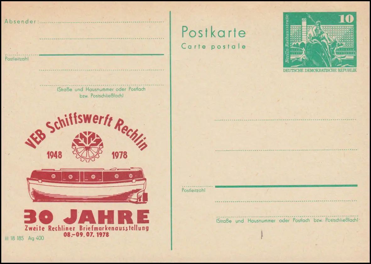 Zudruck-Ganzsache DDR-Postkarte P 79 Bauwerke Großformat 10 Pfennig Berlin Rathausstraße, 30 Jahre VEB Schiffswerk Rechlin / Zweite Rechliner Briefmarkenausstellung Juli 1978 - Zudruck in roter Farbe