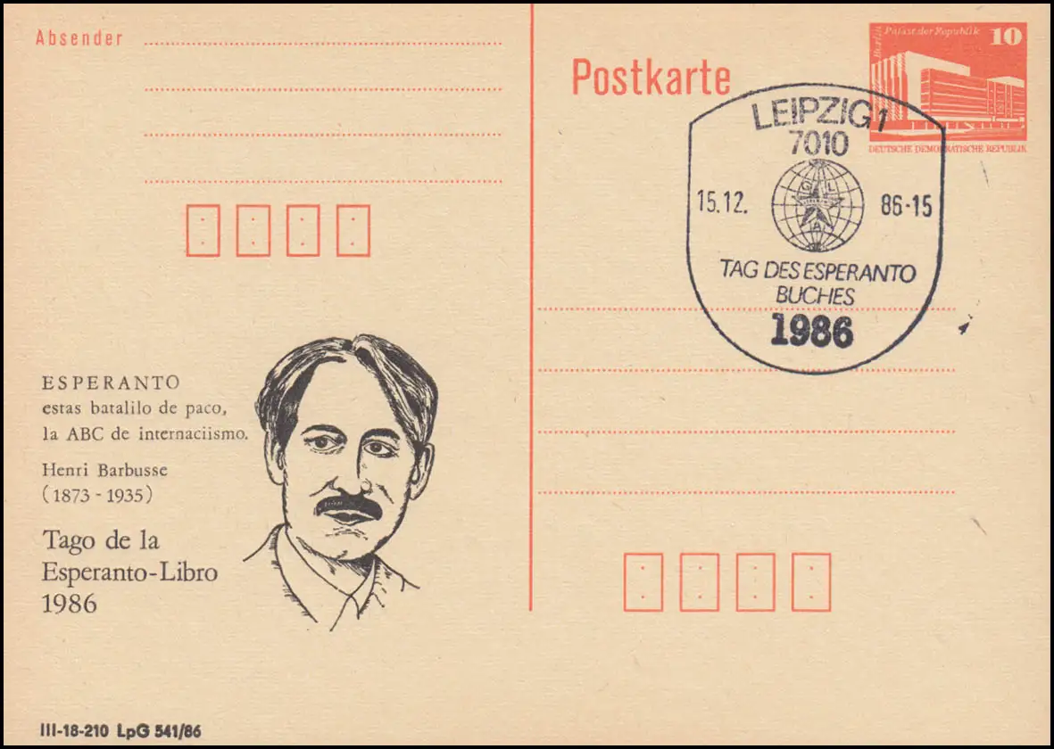 Carte postale DDR P 86I Bauwerke Petit format 10 Pfennig Berlin Palace de la République / orange, sans mention d'impression, cachet spécial: LEIPZIG Jour du livre Esperanto / Logo Espéranto 15.12.86 N° de catalogue: P86I Vérification: original Numéro d 'article: 00000000044503